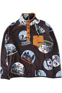 Casual fit, half placket mock neck fleece pullover with logo snap closure, elastic binding on top collar edge, sleeve cuffs and bottom opening, single chest pocket, jersey lined zip hand pockets, reinforced woven fabric overlay at elbows.